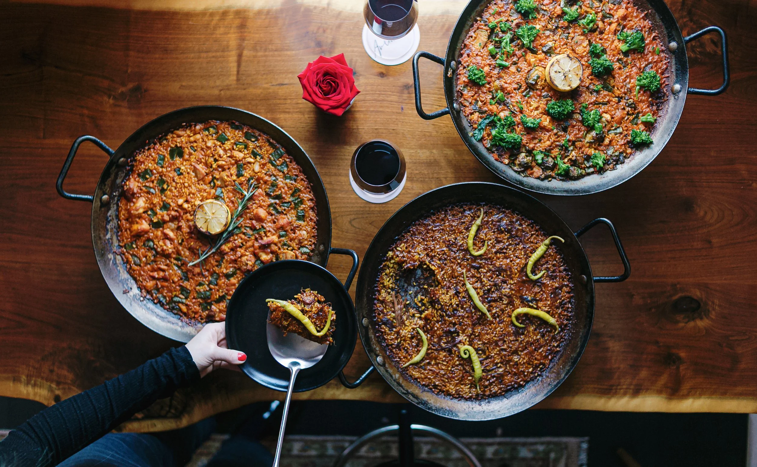 boneless chicken thigh, catalan sausage, chorizo, english pea, cauliflower, romano bean, broccolini, piquillo pepper, saffron, sofrito
